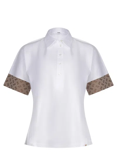Herno polo made of white cotton. Classic collar. Buttons on the front. Short sleeves. Logo contrast detailing on the sleeves. Gold logo plaque at the hem and on the back of the neckline. 100% cotton