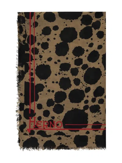 This scarf embodies bold and contemporary elegance. the fabric features a brown background dotted with irregular black patches, evoking a refined animalier pattern that adds character and movement. framing the design, red lines along the left and lower edges create a striking and sophisticated contrast, while the herno signature printed in red in the lower left corner adds a distinctive and recognizable touch. the slightly fringed edges suggest a soft and fluid texture, ideal for wrapping in style during the cooler seasons. it is an accessory designed for those who love to express their personality through refined details and bold color combinations. dimensions: 200x140 cm 51% wool, 49% silk Composition: 51% % Wool, 49% % Silk