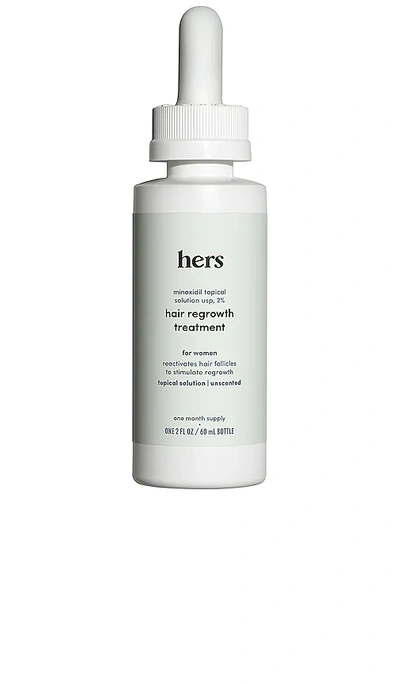 hers 2% Minoxidil Topical Solution Serum in N/A. Size all. Regain your mane with hers Minoxidil 2% Hair Regrowth Treatment. The topical solution is specifically formulated for women. A couple drops twice a day on the scalp stimulates hair regrowth for a thicker, fuller head of hair.. Suitable for all hair types Unscented. Vegan & cruelty-free. Free of Parabens, Silicones, Sulfates, Mineral Oil, and Artificial Dyes and Fragrances. 2 fl oz/ 60 ml (one month supply). Start with dry hair. Part your hair in a few rows to maximize scalp exposure. Squeeze the dropper to fill the 1 ml line and then slowly release drops over your hair loss area. After applying, allow the solution to absorb and dry completely before styling. Once you're done, wash your hands with soap and water to avoid irritation or ingestion. Do not use if you are pregnant or breastfeeding. HERR-WU3. FNP-MINOX-02-53. hers was founded to fight stigmas around health and wellness issues and to break down barriers for women looking for an easier, more affordable alternative to traditional healthcare. Created with a medical advisory board of women doctors, hers is beauty and skincare that feels like self-care. That's why they offer premium, affordable products for women of all ages, without leaving home - hers has you covered.