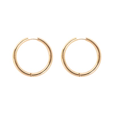 Ruby EarringsThe perfect earrings to create a statement. Simple but bold, these are the Ruby earrings. These earrings are sold in pairs. <p><strong>Composition:</strong> </p> <ul> <li>Metal: Stainless Steel</li> <li>Coating: 14k golden colour PVD</li> </ul> <p><strong>Measurements:</strong></p> <p><strong>Small Ruby:</strong></p> <ul> <li><strong>Outside Diameter:</strong> 3.2cm/1.27''</li> <li><strong>Inside Diameter:</strong> 2.4cm/0.96''</li> <li><strong>Thickness:</strong> 3.9mm/.15''</li> <li><strong>Weight:</strong> 8.9g/0.019lb</li> </ul> <p><strong>Medium Ruby:</strong></p> <ul> <li><strong>Outside Diameter:</strong> 3.8cm/1.49''</li> <li><strong>Inside Diameter:</strong> 3cm/1.18''</li> <li><strong>Thickness:</strong> 3.9mm/.15''</li> <li><strong>Weight:</strong> 9.9g/0.022lb</li> </ul>