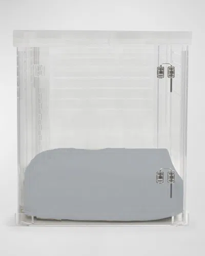 Designed with a solid, clear lucite top, you can use it as a side table, next to your couch, chair, or bed When removed, the walls can be used as a freestanding pet gate that can cover openings up to 8 feet Includes top and bottom trays, two hinged walls, two slideon hinges, and bed cushion For easy transport or storage, disassemble the crate and place the wall panels inside your top and bottom trays Bed cover is easy to wash with a wraparound zip closure Crate crafted of acrylic and metal with a cotton cushion Crate, approx. 38"L x 25"W x 28"T Bed, approx. 28"W x 18"D x 3"T Item Weight (Lbs.): 48.0 Wipe clean; machine wash Made in USA How to Use: To assemble the crate place tray no. 1 on the floor, stand the hinged clear walls in the tray slats, and place tray no. 2 on top. To use it as a freestanding pet gate, remove the crate top and bottom, take your two hinged walls, and zigzag them across your doorway or opening. One of the slideon hinges connects the two zigzag walls. No tools are required for assembly.