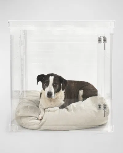 Designed with a solid, clear lucite top, you can use it as a side table, next to your couch, chair, or bed When removed, the walls can be used as a freestanding pet gate that can cover openings up to 8 feet Includes top and bottom trays, two hinged walls, two slideon hinges, and bed cushion For easy transport or storage, disassemble the crate and place the wall panels inside your top and bottom trays Bed cover is easy to wash with a wraparound zip closure Crate crafted of acrylic and metal with a cotton cushion Crate, approx. 38"L x 25"W x 28"T Bed, approx. 28"W x 18"D x 3"T Item Weight (Lbs.): 48.0 Wipe clean; machine wash Made in USA How to Use: To assemble the crate place tray no. 1 on the floor, stand the hinged clear walls in the tray slats, and place tray no. 2 on top. To use it as a freestanding pet gate, remove the crate top and bottom, take your two hinged walls, and zigzag them across your doorway or opening. One of the slideon hinges connects the two zigzag walls. No tools are required for assembly.
