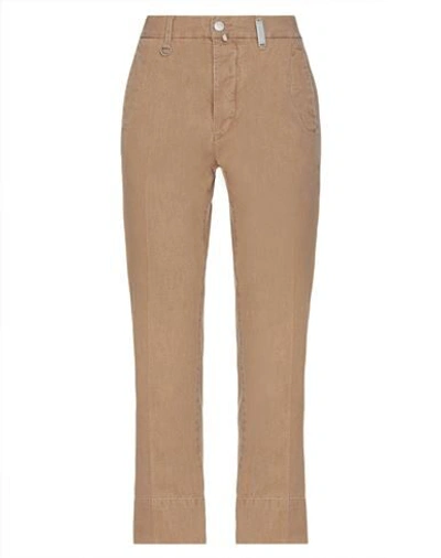 denim, logo, basic solid color, colored wash, high waisted, front closure, button closing, multipockets, worn effect , Color: Camel , Size: 6