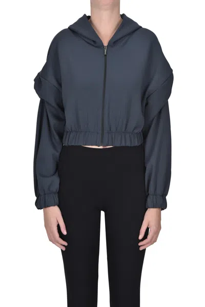 Zippered cropped sweatshirt with hood, pocket, chest designer logo. Sample size: S COMPOSITION: 50% Modal 45% Polyester 5% Elastane Made in Albania