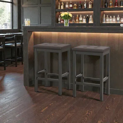 Each bar stool features a padded seat made of high-quality faux leather and elastic sponge, providing luxurious comfort and support for long periods of sitting. The solid rubber wood frame ensures a sturdy and safe structure, making it a dependable seating option for years of use. Equipped with anti-slip foot pads, each stool maintains excellent stability while protecting the floor from scratches. Designed with a 7" high built-in footrest, the stool offers added support and relaxation, allowing you to sit comfortably while enjoying conversations or drinks. The button-tufted seat design adds an elegant touch that complements a range of interior styles, from modern and contemporary to traditional and rustic. Assembly is simple, and the stool is easy to maintain for lasting beauty. Ideal for counter height tables measuring 35" to 39", this stool set creates a welcoming and stylish atmosphere in any dining or kitchen space. Available in brown and black or gray and white, the stools are made from rubber wood, sponge, PVC leather, and plywood. Each stool measures 15.5" x 10" x 24" (L x W x H), with a footrest height of 7", supports up to 330 lbs, and weighs 7.5 lbs. The set is packaged in one box, though quantity may vary by batch.