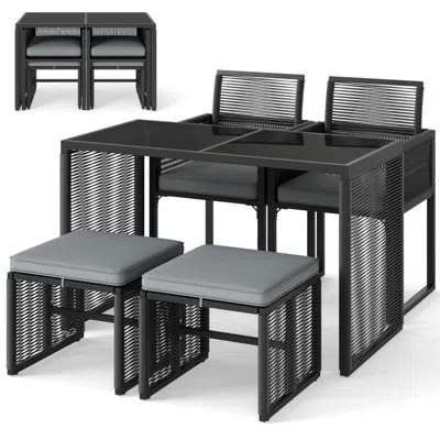Key Features Experience Great Comfort - The patio conversation set features removable cushions filled with elastic sponge for a plush feel, while the contoured backrests and ergonomic armrests provide optimal support. The zippered cushion covers make maintenance easy. Built for Lasting Longevity - The robust metal frame, equipped with adjustable foot pads, ensures exceptional sturdiness and stability, with each chair and ottoman supporting up to 400 lbs. The table boasts a tempered glass top that is enduring, sturdy, and stable, complete with suction cups for secure placement. Save Space with Ease - Maximize your outdoor space with this space-saving outdoor bistro set. The backrests fold down effortlessly, and ottomans can be neatly stored under the chairs, making it perfect for compact living and easy storage. Elegant Aesthetics with PE Rattan - Admire the exquisite craftsmanship of the patio furniture, featuring hand-woven PE rattan. This material is anti-fading, sun-protective, and ensures an elegant appearance that enhances any outdoor setting. Versatile for Every Outdoor Space - From gardens and backyards to decks and poolside areas, the patio conversation set is designed to enhance your outdoor living experience in any setting.Specifications Color of PE Rattan - Black Color of Cushion - Gray Material - PE Rattan, Metal, Polyester, Sponge Dimensions of Table - 45" x 22" x 28" Dimensions of Each Chair - 21" x 20.5" x 33.5" Height of Seat - 17" Size of Each Seat Cushion - 18.5" x 18" x 2.8" Dimensions of Each Ottoman - 17" x 17" x 14" Size of Each Ottoman Cushion - 17" x 17" x 2.4" Load Capacity of Dining Table - 100 lbs Load Capacity of Each Chair - 400 lbs Load Capacity of Each Ottoman - 400 lbs Total Net Weight - 86 lbs Box QTY - 2 (May vary by batch) Package Includes - 1 x Table, 2 x Chairs, 2 x Ottomans, 2 x Seat Cushions, 2 x Ottoman Cushions, 1 x User Guide