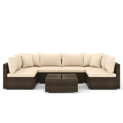 7 Pieces Patio Rattan Furniture Set With Sectional Sofa Cushions-beige In Pink