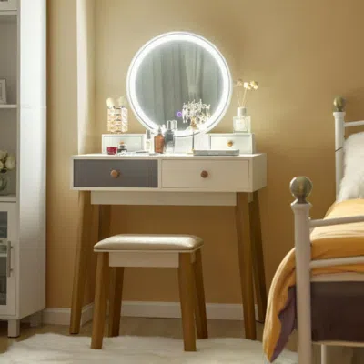 If you are admiring the exquisite lifestyle or you have trouble in touching beautiful makeup every day. This is the meticulously designed vanity set. Â It is made of high quality MDF and in great appearance with a round mirror and 4 drawers and the wood surface becomes smooth and solid after delicate workmanship. The solid structure could hold a lot of cosmetics and other small items. It also fits various environments such as bedroom and living room. The light can be lit up by touch switch and a