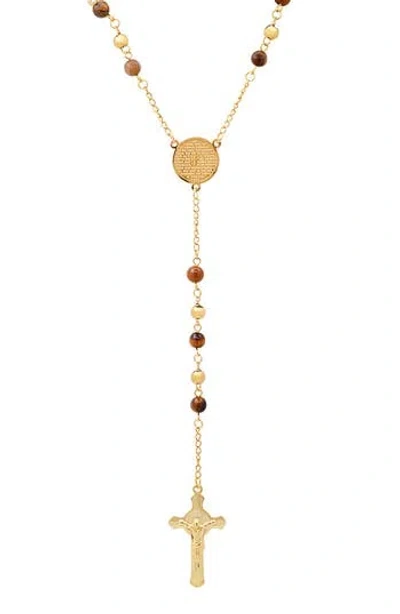Mens' 18k Gold Plate Stainless Steel Crystal Rosary Necklace In Brown/gold
