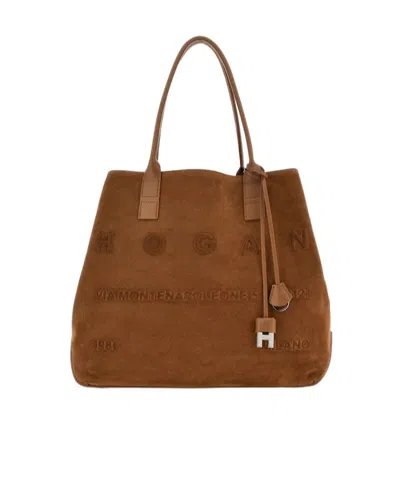 HOGAN Medium Script Logo Leather Shoulder Bag In Brown