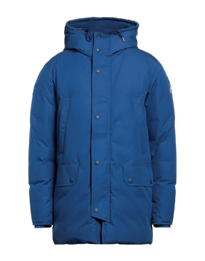 plain weave, brand logo, solid color, hooded collar, single-breasted , long sleeves, goose down interior, snap buttons fastening, zipper closure, multipockets, pocket with flap, contains non-textile parts of animal origin, single-breasted jacket , Color: Blue , Size: 4