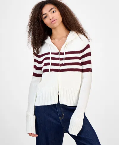 HOOKED UP BY IOT Juniors' Striped Hooded Zippered Sweater In White