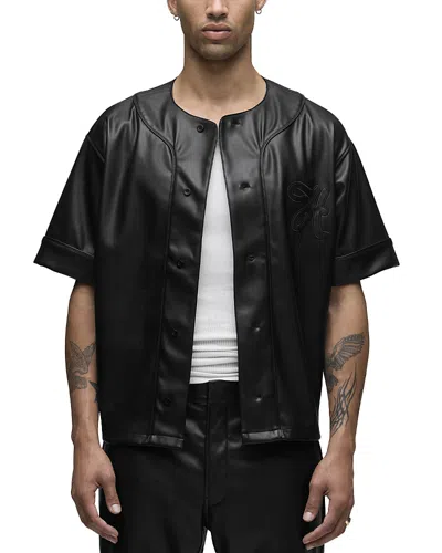 A classic reimagined, this ballpark-inspired jersey takes an edgy turn in buttery soft faux leather. Front button closure Crewneck Short sleeves Polyurethane Machine wash, tumble dry Imported