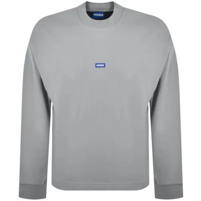 HUGO Blue Nedro Sweatshirt In Grey. A chunky ribbed neckline with ribbed cuffs on the long sleeves. The signature HUGO logo patch is featured on the chest. 100% Cotton.