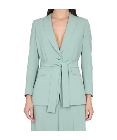 This sophisticated jacket embodies tailored elegance with a deep V-neckline and front button closure. A belted waist accentuates the figure, while long sleeves and structured shoulders provide a polished look. A subtle pleat at the back enhances its clean design, making it a versatile addition to any luxury wardrobe. Deep V-neckline Front button closure Belted waist Long sleeves Structured shoulders Subtle pleat at the back