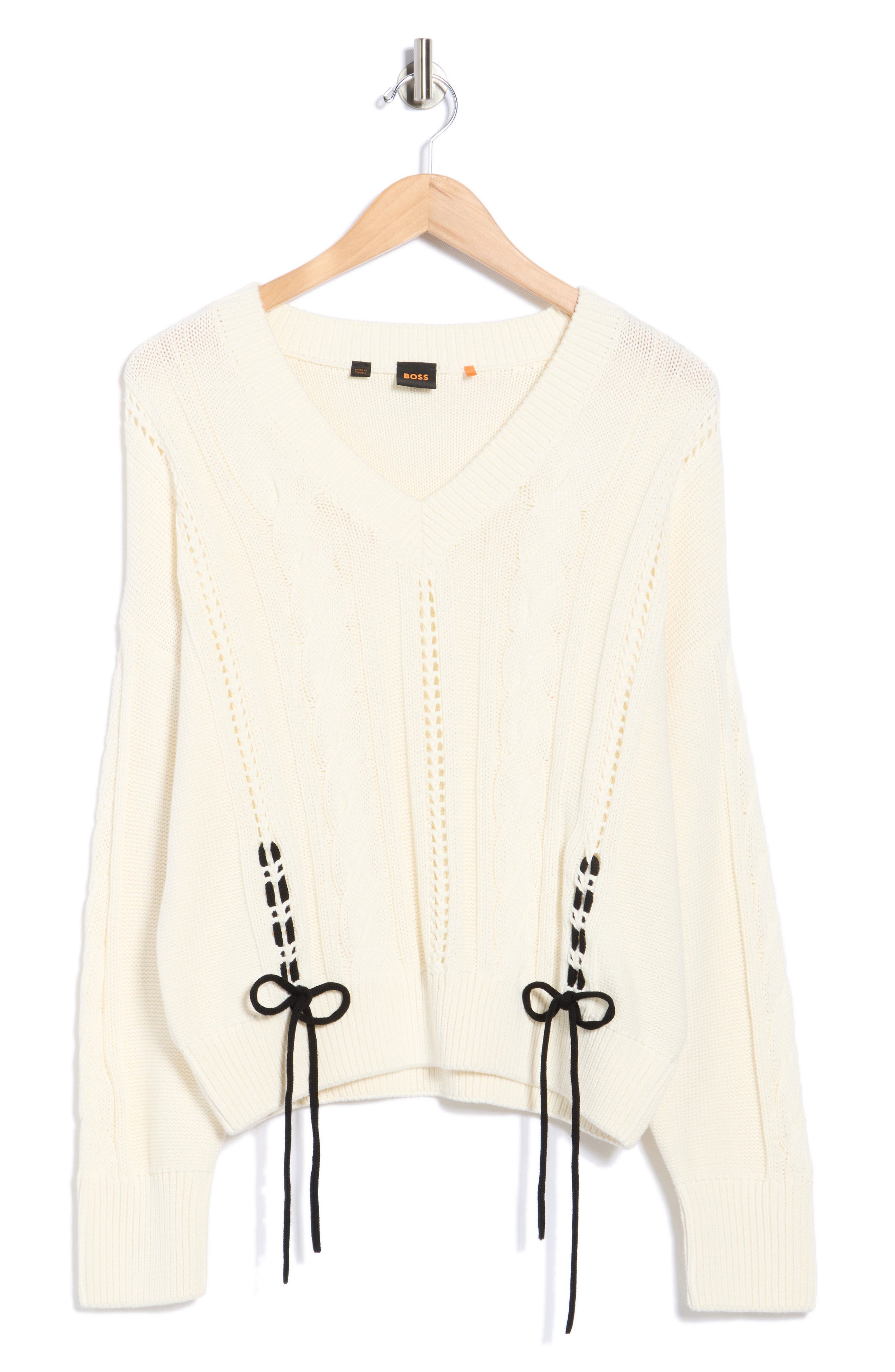 Soft cotton comforts this oversized pullover sweater, accented with contrast lace-up ribbons and floppy bows for a charming touch. Open-work details add breathability, making it perfect for year-round wear. V-neck Long sleeves 100% cotton Machine wash, dry flat Imported
