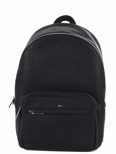 Boss backpack in black hammered faux leather. Front zip pocket. One handle. Zip closure. Interior pockets. Padded and adjustable nylon shoulder straps. Front logo. Padded back.Dimensions: height 45 cm, width 30 cm, depth 19 cm100% polyester