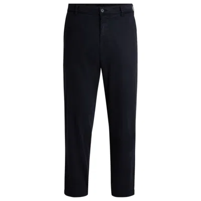Hugo Boss Mens Bottoms. Fashion category: Pants & Leggings. SKU: 50522666-404. Color: Dark Blue. Hugo Boss Perin Tapered-Fit Trousers. Made from stretch twill, this pair of trousers features a tapered fit and regular rise. It includes a button and zip closure, an elastic waistband, tapered legs, a French pocket, and a welt pocket with buttons for added detail. 93% Lyocell, 6% Elastomultiester, 1% Elastane.