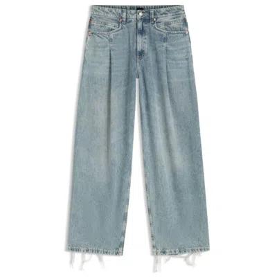 With their wide leg and pleats, these BOSS Womenswear jeans deliver a flattering silhouette. Green-cast rigid denim with a vintage blue wash. Distressed hems.