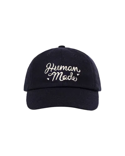Six-panel cap with a basic silhouette, Human Made logo embroidered on the front, and leather adjuster embossed with “Dry Alls”. Navy Made from wool-nylon flannel Brand logo embroidered on the front Adjustable strap at the back Body: 84% Wool 16% Nylon Belt: Cow Leather
