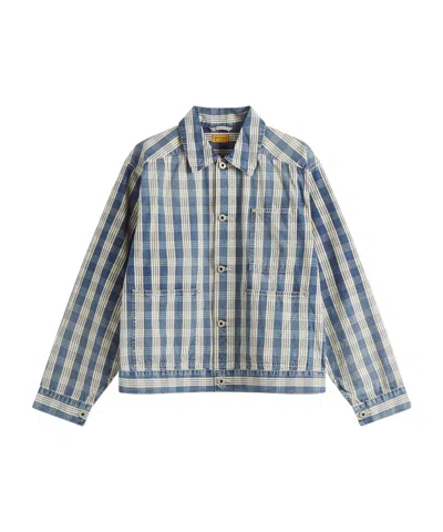 indigowashed check denimchain stitched seamscollarbutton closurechest pocketside pocketsback embroidered logocropped hemboxy fit