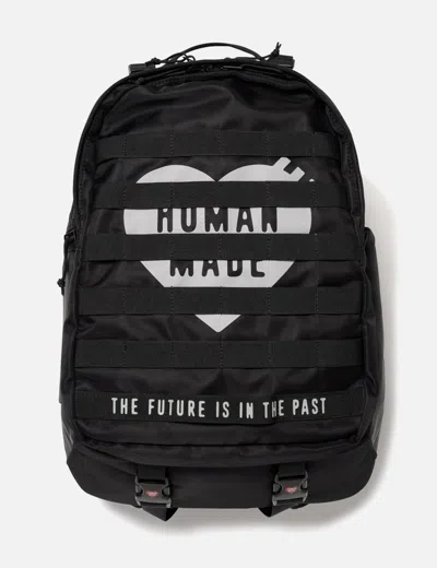 Human Made Military Backpack Military-inspired backpack Made of thick, shiny nylon twill fabric Stain-resistant polyester Oxford lining Front and back storage compartments Heart logo and tape lines Cushioned sleeve pocket for a PC or tablet Drawstring pocket on the right side Zip pocket on left Padded mesh back with heart logo Adjustable waist strap Buckle strap on the bottom B4-sized storage Color: Black