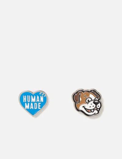 Human Made Pins Set Iconic graphics Pin set featuring Stainless steel components Heart logo with a pulldog graphic Three-dimensional graphics Rubber safety clasp on the back fastener Color: Blue