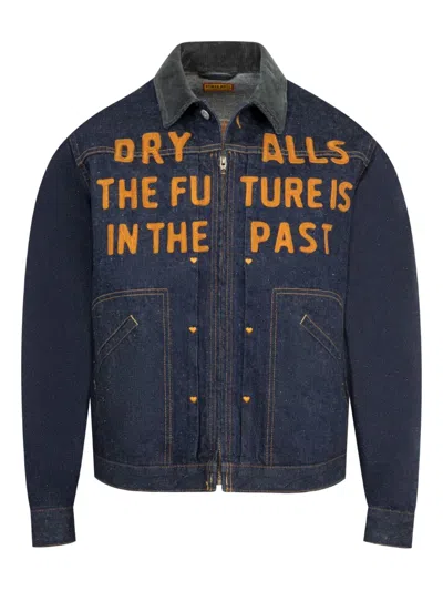"Dry alls the future is in the past" Human Made denim jacket made of thick, textured selvedge denim. Short construction, compact structure and front zipper. Collar features a corduroy insert. The surface undergoes a single wash that gives a wrinkled, even texture. Embroidered chain motif on front and back, logo button on collar and cuffs, small heart embroidery next to zipper. || - Solid color - Long sleeves - Front zipper closure - Corduroy details on collar - Embroidered chain motif on front and back - Printed logo button on collar and cuffs - Heart embroidery near zipper - Regular fitExtra Description: Solid colourRegular fit;Long sleeves