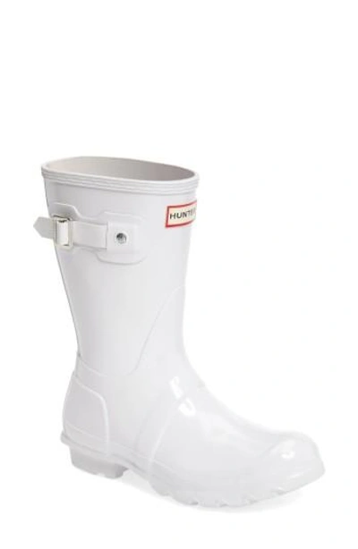 Comfort and quality combine in a glossy, water-tight rubber boot finished with a traction-gripping sole. A subtle tonal design circles the top, while an adjustable buckle at the side adds interest. Style Name: Hunter 'Original Short' Gloss Rain Boot (Women). Style Number: 283582 4. Available in stores.