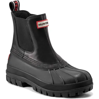 Introducing the Hunter Sutton Leather Boot, a stylish and functional addition to your footwear collection. Crafted in black nubuck leather and rubber, this boot combines British heritage with modern innovation for all-weather wear. Featuring a waterproof design, pull loop, and elasticized gusset, the Sutton boot is as practical as it is fashionable. With pull on styling and a lightly padded insole, you'll stay comfortable all day long. The rubber sole provides traction and durability, while the 1.18-inch heel adds a touch of elevation. Imported and measuring 15 inches in boot circumference, the Hunter Sutton Leather Boot is a must-have for any woman's shoe closet.