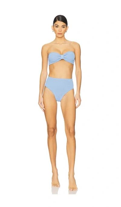 Hunza G Ruby Bikini Set in Blue. Hunza G Ruby Bikini Set in Blue. 97% polyamide 3% elastane. Made in Morocco. Machine wash. Unpadded cups. Smocked fabric detail. Item sold as set. HUNG-WX211. RUBY. Hunza G is a London-made clothing label. Originally born as Hunza in 1984 under the direction of Peter Meadows, the label enjoyed huge success with its signature, unique crinkle stretch fabric. The Hunza dress became an iconic 80s piece with Julia Roberts wearing it in pretty woman. 30 years later, creative director Georgiana Huddart has collaborated with Peter to re-launch the brand as Hunza G, one size fits all luxurious swim.