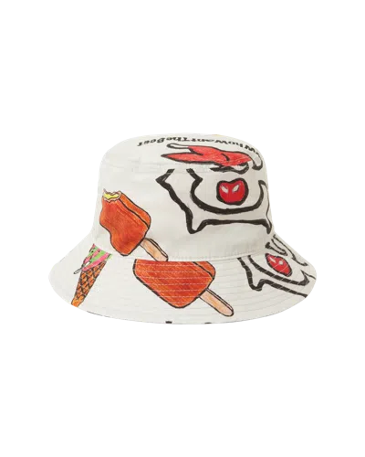 Bucket hat featuring a vibrant all-over print with playful graphics. Ivory 100% Cotton
