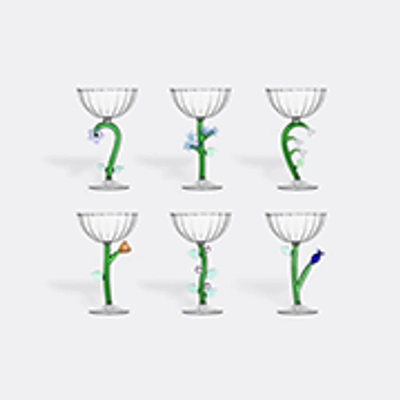 Conspicuous for a distinct cheerfulness that permeates each piece in the collection, the 'Botanica' series by Alessandra Baldereschi for Ichendorf Milano is brought to life by the Italian designer's imagination of flowers in a spectrum of colors. Here, a family of single stems in series of arrangements appear as a lively stems across six champagne glasses for an almost sculptural presence. The result is a memorable set suited to both formal and non-formal environments, and one that can be paired with other glassware pieces from this collection.