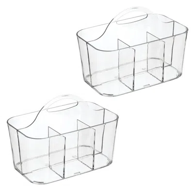4-Section Storage Caddy with Handle. Features: DIVIDED STORAGE - Three smaller compartments and one larger compartment keeps items upright, and easily visible, and bottom drainage holes allow water to escape if used in the shower. ELEVATED DESIGN - The crystal-clear construction lends a sleek, clutter-free look to this organizing essential, while the easy-grip top handle creates a portable, on-the-go storage solution. VERSATILE STORAGE - This do-it-all design works in the kitchen as a flatware caddy, in the bathroom as a shower caddy or cleaning caddy, and in the office as a desk caddy DIVIDED STORAGE - Three smaller compartments and one larger compartment keeps items upright, and easily visible, and bottom drainage holes allow water to escape if used in the shower. QUALITY CONSTRUCTION - Made of BPA-free plastic that is shatter-resistant. EASY CARE - Clean with mild soap and water ELEVATED DESIGN - The crystal-clear construction lends a sleek, clutter-free look to this organizing essential, while the easy-grip top handle creates a portable, on-the-go storage solution. MADE TO FIT - Storage caddy measures 6" x 9.62" x 6.75" high / 15,2 cm x 24,4 cm x 17,1 cm. Features: ELEVATED DESIGN - The crystal-clear construction keeps items easily visible, while the easy-grip top handle creates a portable, on-the-go storage solution; Bottom drain holes help water escape, allowing toiletries to dry thoroughly between showers. Features: VERSATILE STORAGE - Not just limited to the bathroom, this portable tote is great for organizing other rooms of your home, like bedrooms, laundry rooms, or craft rooms, to keep essentials organized and easily accessible.
