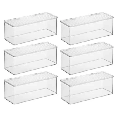 Make space for what belongs with the iDesign Hinged-Lid Storage Box. Perfect for organizing everything from small kitchen gadgets to your most reached-for bath essentials, the clear design provides easy visibility, making it easy to find what you're looking for. The durable plastic construction ensures items are protected while remaining accessible and visible thanks to the built-in hinged lid. This easy-open lid enables you to stack and store, creating space-saving vertical storage. Designed with versatility in mind, this lidded storage box organizes offices, closets, bedrooms, craft rooms, or anywhere else throughout the home that needs organizing. With iDesign, you can live simply every day. BUILT-IN HINGED LID - This plastic storage box features a transparent hinged lid to ensure contents are always visible and accessible SMART STORAGE - Create a functional storage solution anywhere you need with the iDesign Hinged-Lid Storage Box; Its generous capacity has room to store your most reached-for essentials, from small kitchen gadgets to bathroom essentials to office supplies and more; The versatile design blends seamlessly with your decor, allowing you to keep various essentials accessible and contained; Set of 6 SMART STORAGE - The versatile design creates a functional catchall for essentials throughout the home, keeping clutter under control while blending seamlessly with your decor QUALITY CONSTRUCTION - Made of BPA-free plastic that is shatter-resistant; Food safe; EASY CARE - Clean with mild soap and water; Do not place in the dishwasher MADE TO FIT - Each storage box measures 5.75" x 13.37" x 5" high