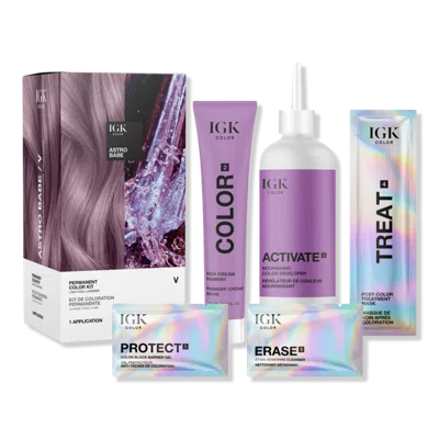 PERMANENT COLOR KIT ASTRO BABE. Benefits: Leaves hair 15x shinier* and 88% softer and smoother strands with 40% reduced breakage**. Mistake-proof, easy-to-follow application. Featuring Squalane, Orchid Extract and Bamboo Extract. Key Ingredients: Squalane. Orchid Extract. Bamboo Extract. Includes: 1 Application. Protect 1 Color Block Barrier Gel (0.07 oz). Color 2 Rich Cream Pigment (1.7 oz). Activate 3 Nourishing Color Developer (2.5 oz). Treat 4 Post Color Treatment Mask (0.23 oz). Erase 5 Stain-Removing Cleanser (0.07 oz). 1 Pair of Gloves.