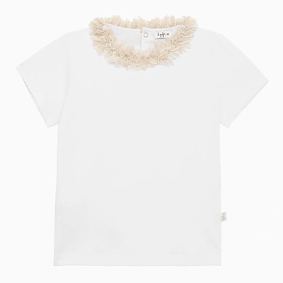 Crew-neck T-shirt in white stretch cotton jersey by Il Gufo, featuring short sleeves, collar with frayed detail and snap fasteners on the back.