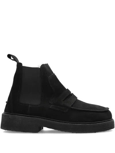 black suede upper shearling lining elastic side panel round toe flat sole