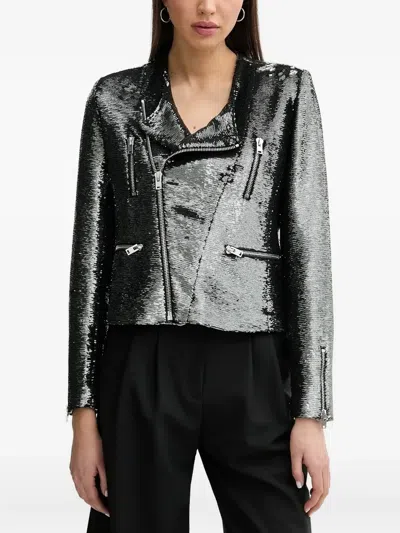 grey sequin embellishment asymmetrical zip fastening long sleeves zip cuffs cropped hem