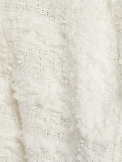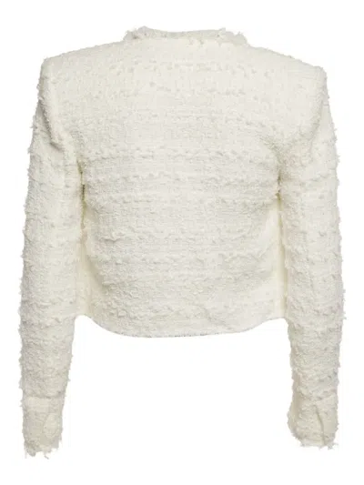 white textured tweed open front fringed detail collarless structured cut Condition: GOOD. This previously owned and used item is in good condition with minimal signs of use. This may include fading of material or plating and scratches.