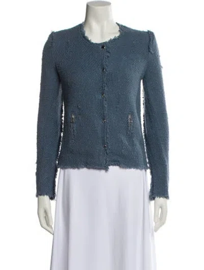 Iro Evening Jacket Blue Tweed Pattern Raw-Edge & Distressed Accents Collarless Zip Pockets & Zip Closure Designer Fit: Designed for a slim fit, those with a curvy figure may wish to take one size up. | Iro Tweed Pattern Evening Jacket in Blue, Women's US2, FR34 | XS