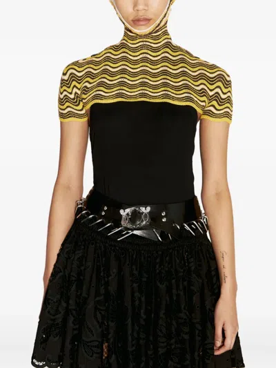 yellow wave pattern short sleeves high neck open shoulders knitted construction