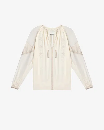 Bluse aus besticktem Seidengeorgette Rundhalsausschnitt mit Schlitz Kordel mit Troddeln Lange Raglanärmel Geknöpfte schmale Bündchen Grafische Stickereien auf Ärmeln und Vorderseite Fließende Passform Referenz: HT0597FAC1J07I23EC ORIS Color: naturfarben; Size: 34, 36, 38, 40, 42, 44