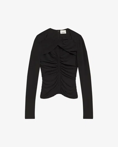 Top in gathered jersey V-neckline with a twisted yoke Gathered front Long sleeves Done up in back with a hook and a hidden zipper Fitted cut Style: HT0495FA-B3K01I VANDALIA