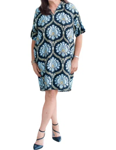 The kind of easy and flattering dress you'll be reaching for all season long.Captivating and bold mini dress showcases elbow-length sleeves and a shift silhouette. Adorned with a striking floral pattern in shades of blue, white, and gold. Designed for a streamlined look. Features a convenient pull-on closure. Exudes effortless style and comfort.