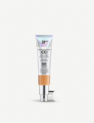 Working with leading plastic surgeons to develop clinically proven beauty solutions, IT Cosmetics aims to empower through the confidence that comes with being happy in your own skin. The Your Skin But Better CC+ cream hydrates and perfects your complexion with full coverage, while broad-spectrum SPF 50+ provides the protection you need to prevent discolouration. Formulated with hydrolyzed collagen, peptides, niacin, hyaluronic acid, antioxidants and vitamins, it also helps to reduce the appearance of fine lines, redness and dark circles.| IT Cosmetics Your Skin But Better CC+ Cream with SPF 50+Application: Apply 1-2 pumps of CC+ Cream SPF 50 to clean skin using your Heavenly Luxe Complexion Perfection #7 Makeup Brush for effortless buffing and blending. CC+ Cream can be used as your moisturiser, concealer, full-coverage foundation, based on your coverage needs. For best results apply a smooth, even layer to your face, neck and décoletté for complexion perfection.Key Benefits: Your full-coverage foundation, it's hydrating, anti-ageing, and with SPF50 - in one step. Delivers flawless looking coverage - won't crease or crack. Works to improve the look of skin concerns include redness and dark circles.Pair With: Bye Bye Under Eye Concealer, Confidence In A Cream, Heavenly Luxe Complexion Perfection Brush #7, Superhero Mascara32mlPlease note, packaging may varyFor hygiene reasons, this product cannot be exchanged or refunded, unless faulty.
