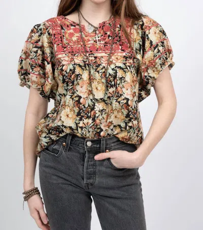 The short sleeve tee you'll want in every color.Luxurious floral print of black roses and delicate mauve pink embroidery. Puff short sleeves and boxy silhouette. 100% Cotton.