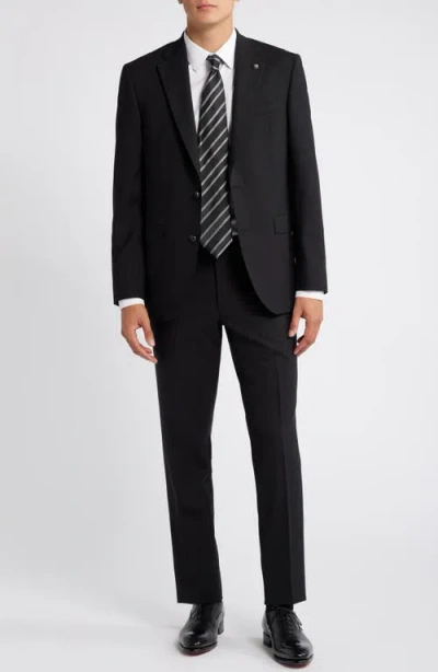 Subtly textured Italian wool crafted with a touch of stretch brings comfort and distinction to a suit tailored with softer construction in the shoulders and a fitted silhouette for a smart, all-occasion look. The flat-front trousers sit just above the hips and feature lightly tapered legs to blend traditional detailing with a crisp, modern profile.Fabrication: Wool is the most common of suiting fibers, with durable, flexible properties that help formalwear maintain its shape. Naturally breathable and water-resistant, wool retains heat when it's cold and vents heat when it's warm.Formality: Formal occasions including business meetings, weddings, funerals and other settings that require you to look smart without being too casual Jacket has notched lapels; button cuffs; chest pocket; flap pockets; interior pocket; side vents Trousers have zip fly with button-tab closure; flat front; slant pockets; back button-besom pockets; tapered legs Jacket is lined Trousers are unhemmed 98% wool, 2% elastane Made in Canada