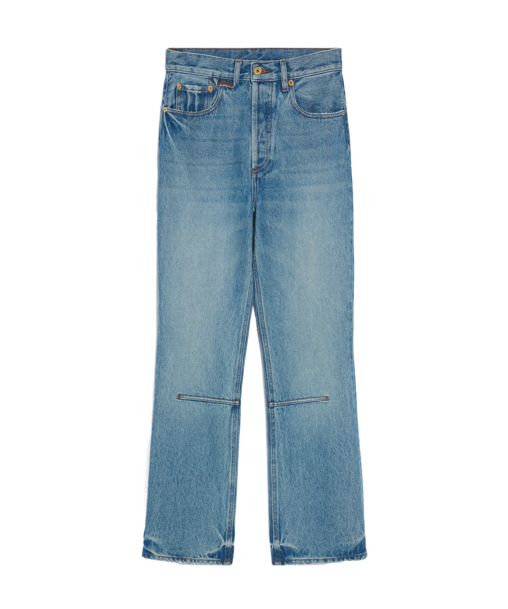 Five pockets, metal studs and rivets, button placket, horizontal knee seam, large denim patch above the back pocket.