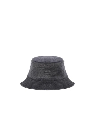 Dark grey wool fisherman hat. Features Jacquemus signature on the front, tone-on-tone stitching. Size EU.